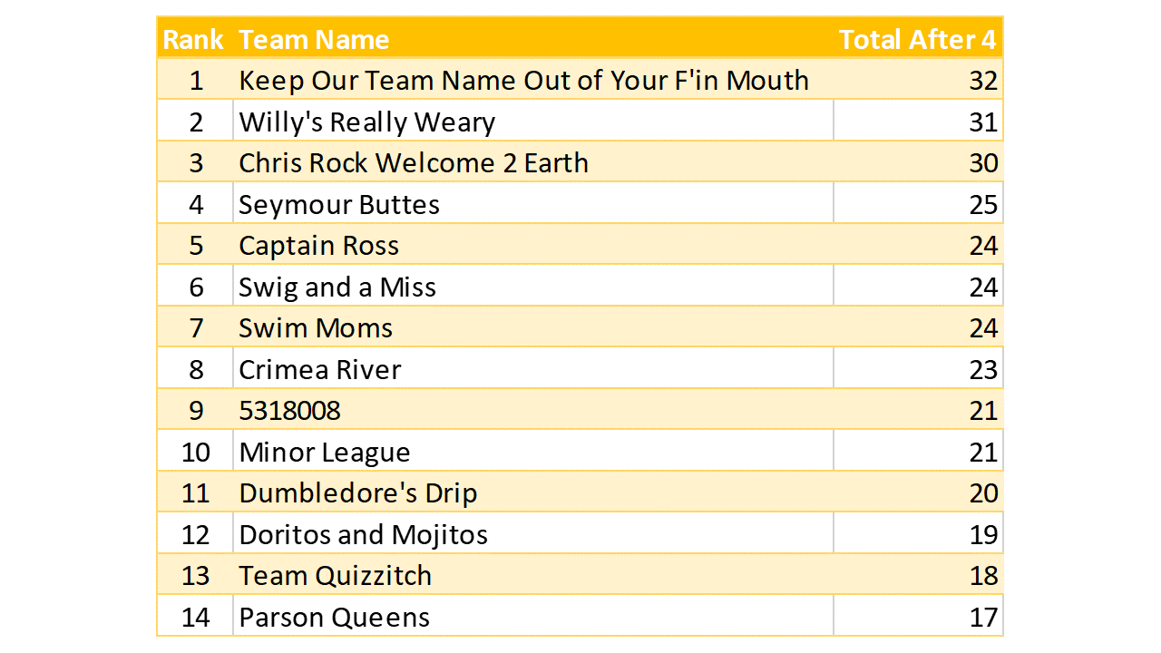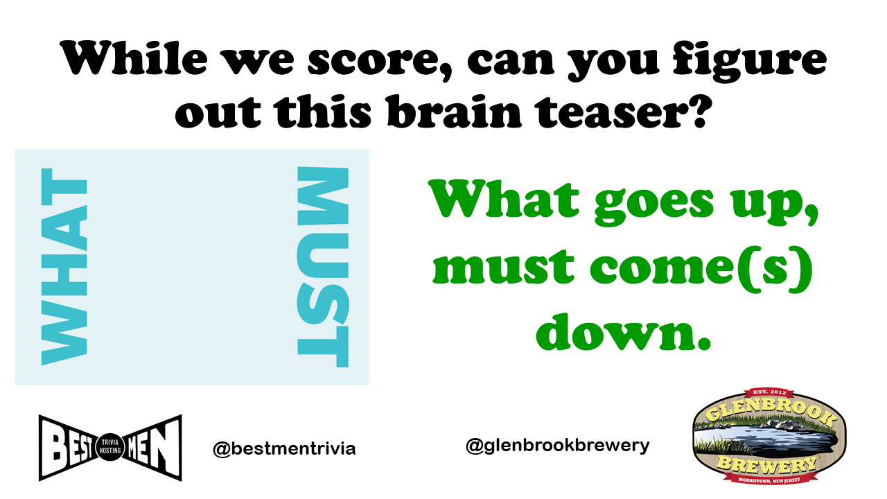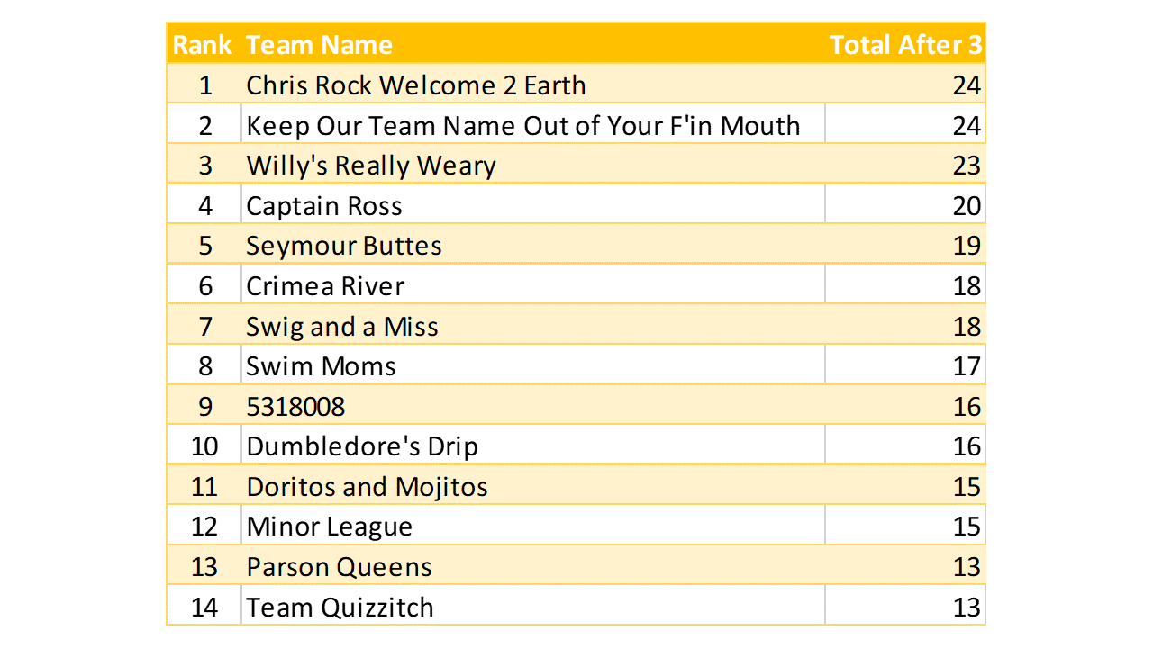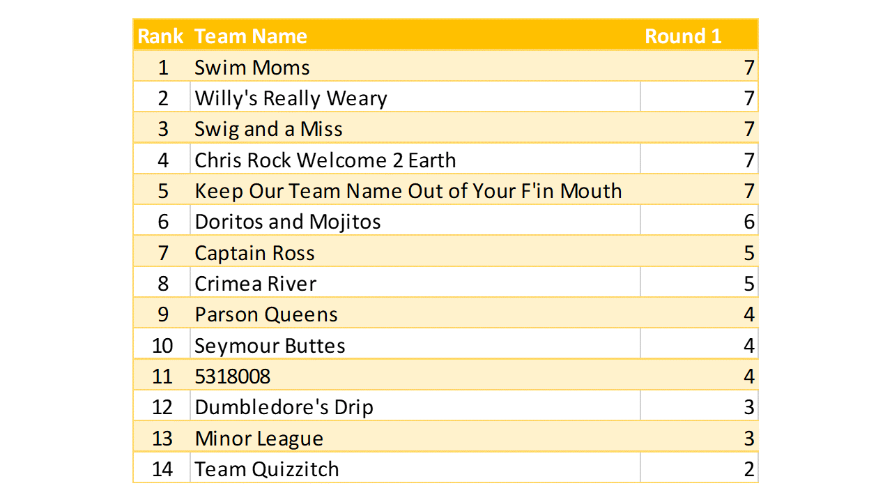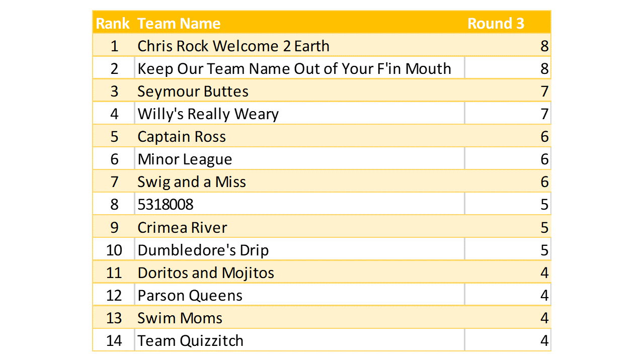 Great vibe at tonight’s game. We had a color on the brain that sometime worked in teams’ favor, and sometimes not. Lots of crowd interaction, good mix of question levels. A higher scoring game than last week’s.