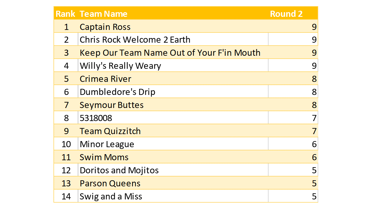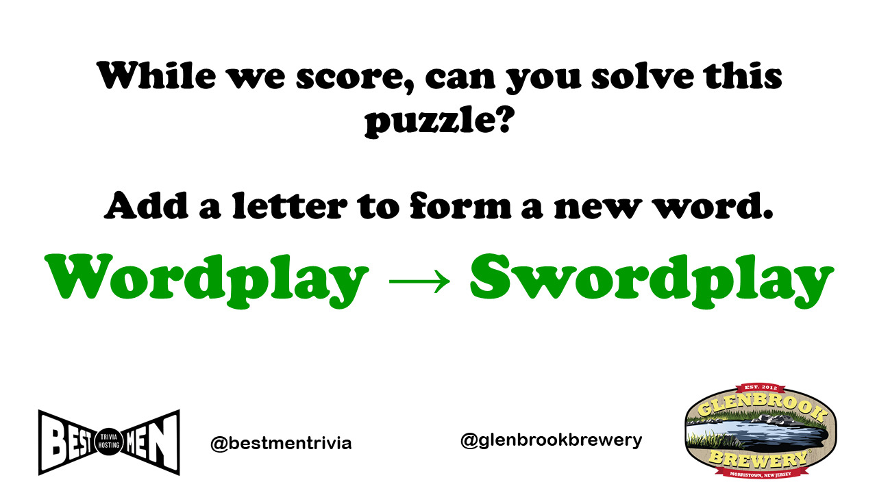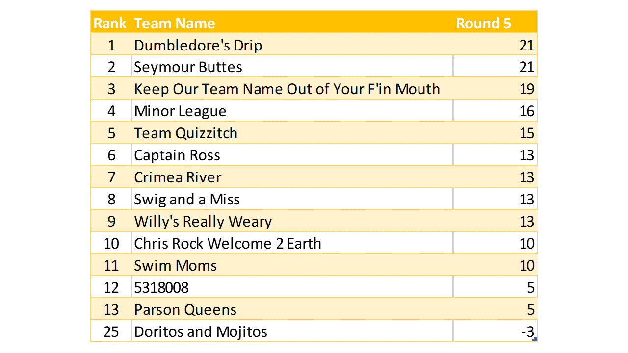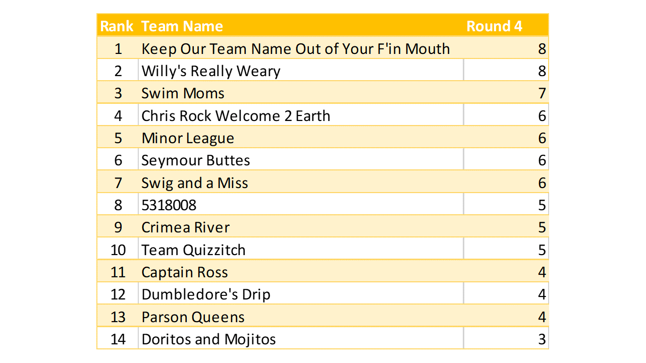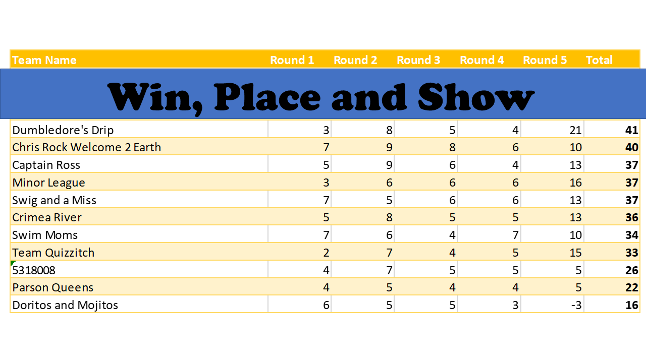 Great vibe at tonight’s game. We had a color on the brain that sometime worked in teams’ favor, and sometimes not. Lots of crowd interaction, good mix of question levels. A higher scoring game than last week’s.