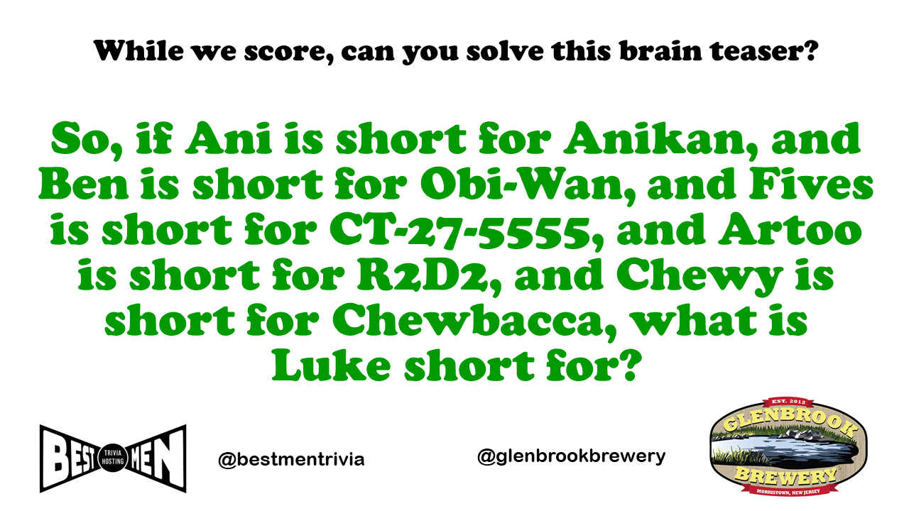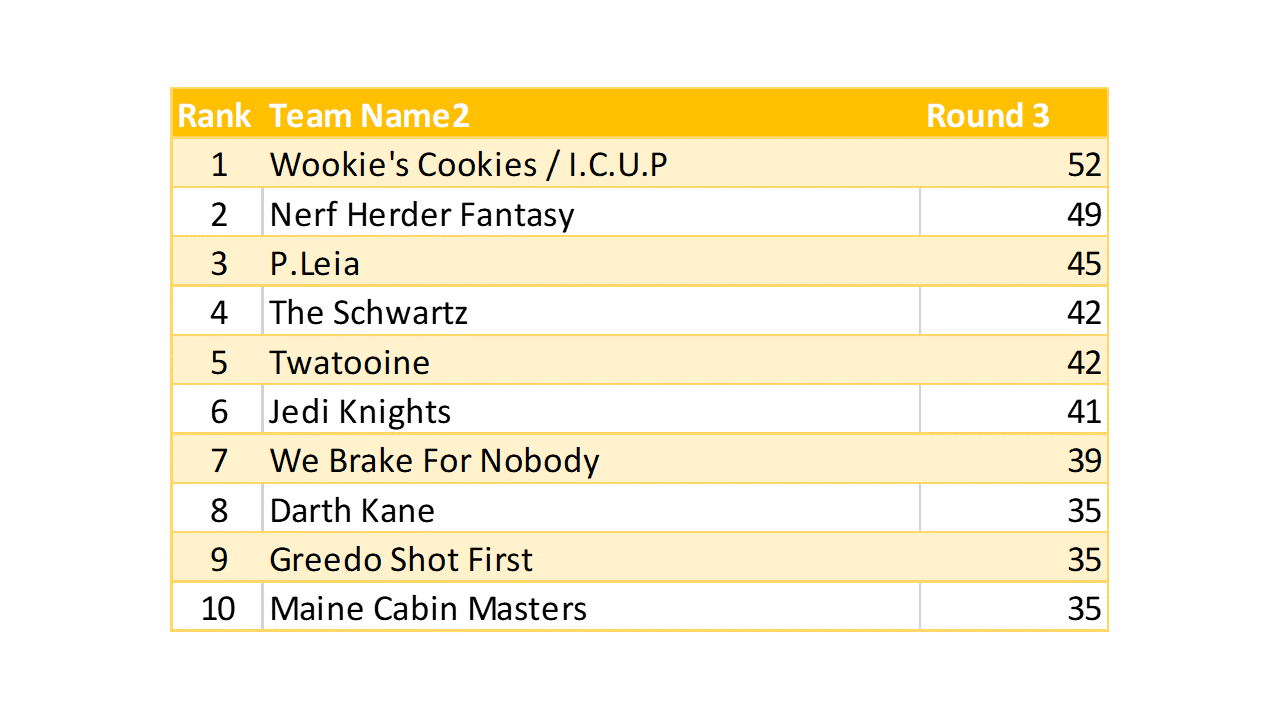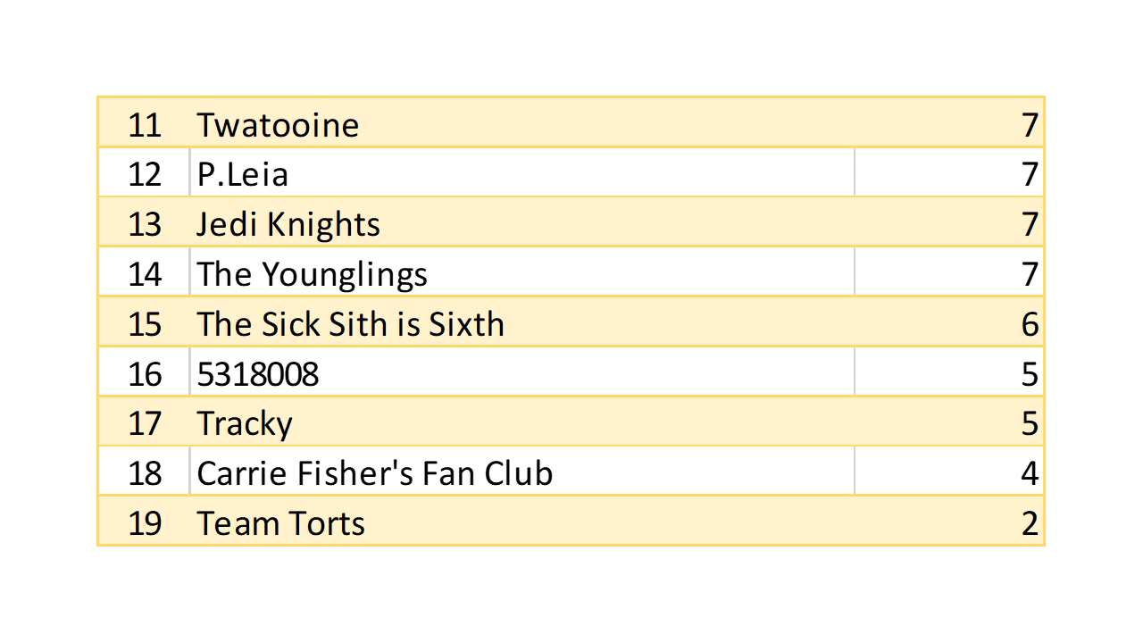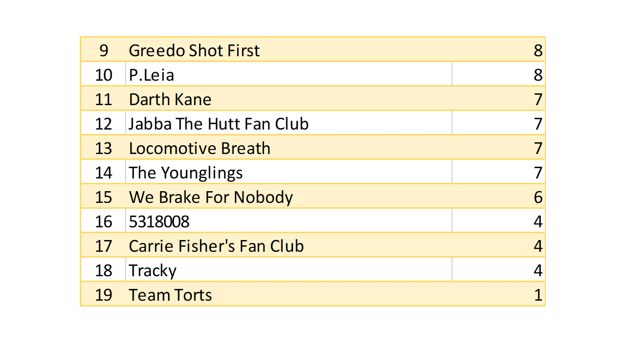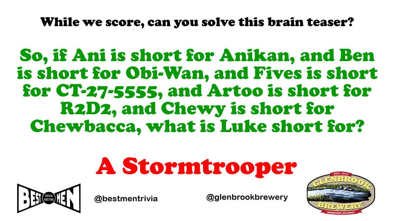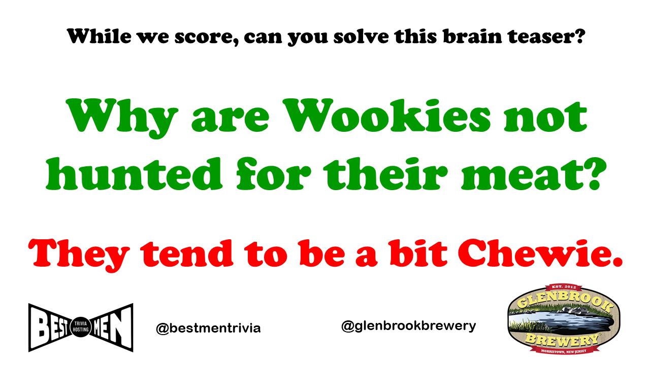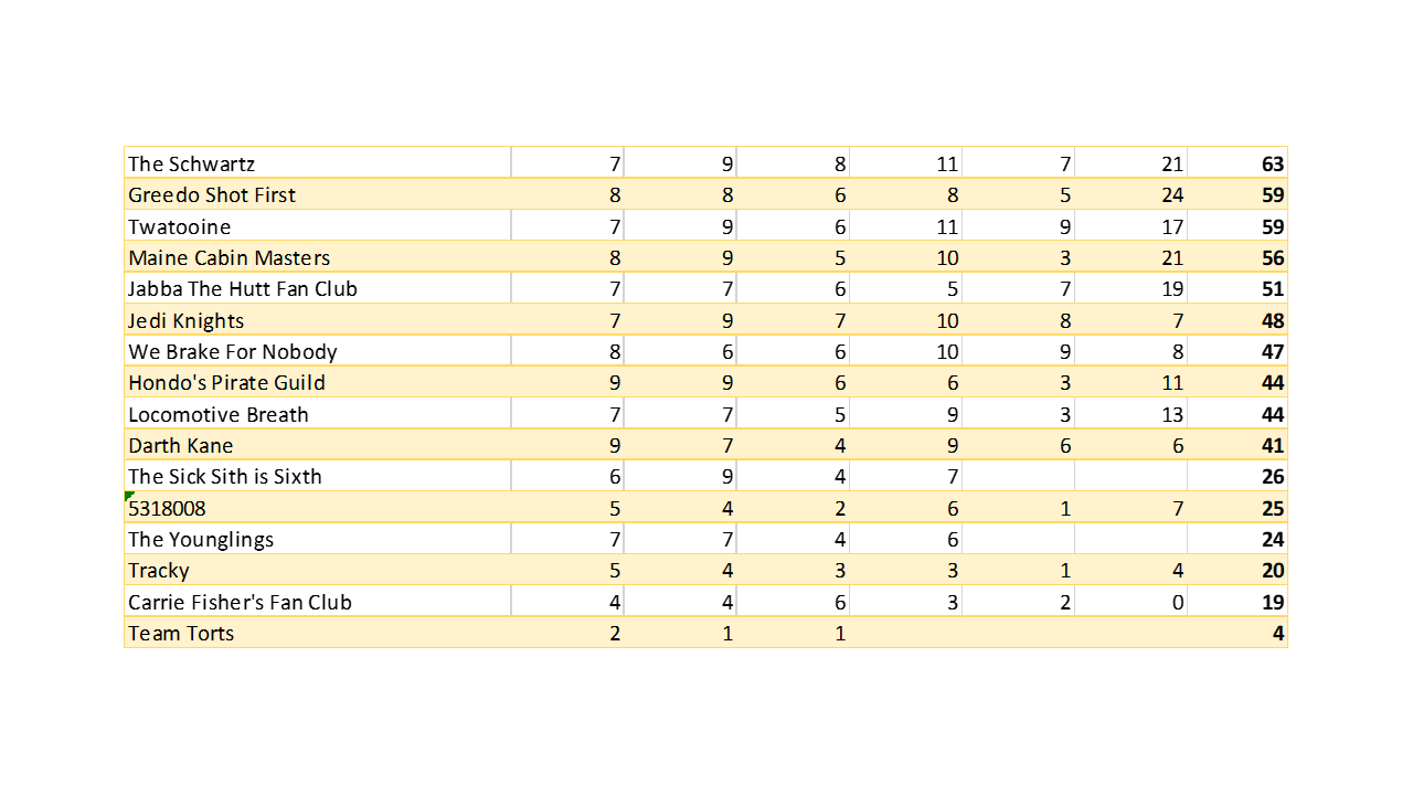 19 teams channeled the Force and came out to compete. We had a super-sized game of 6 rounds with 9 questions each, lots of visuals (visit the website) and a tie breaker to end the night with old friends and teammates pitted against each other in a head-to-head smackdown naming the 15 characters who racked up the most appearances in a Star Wars live action movie.