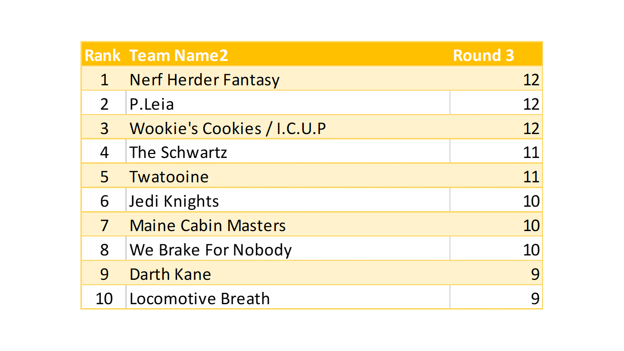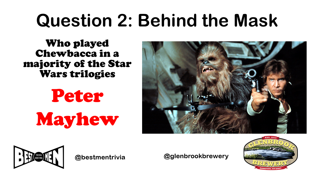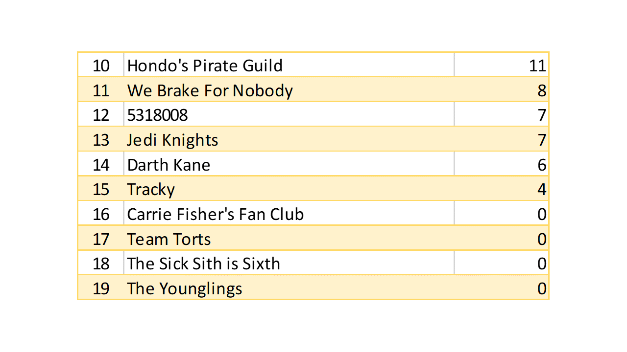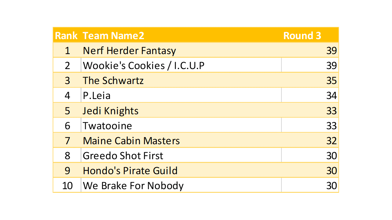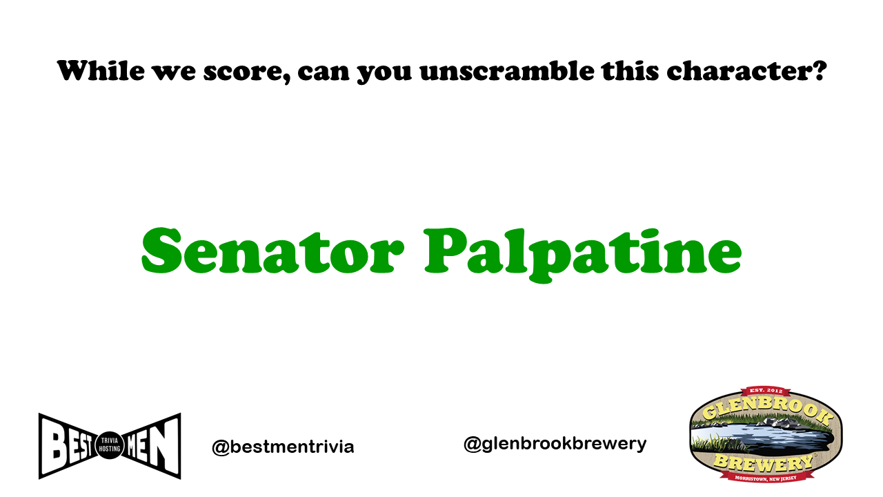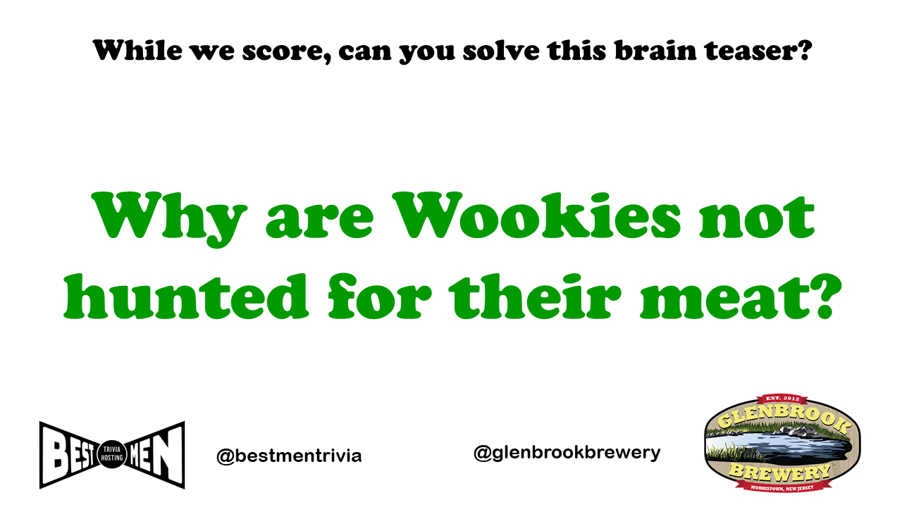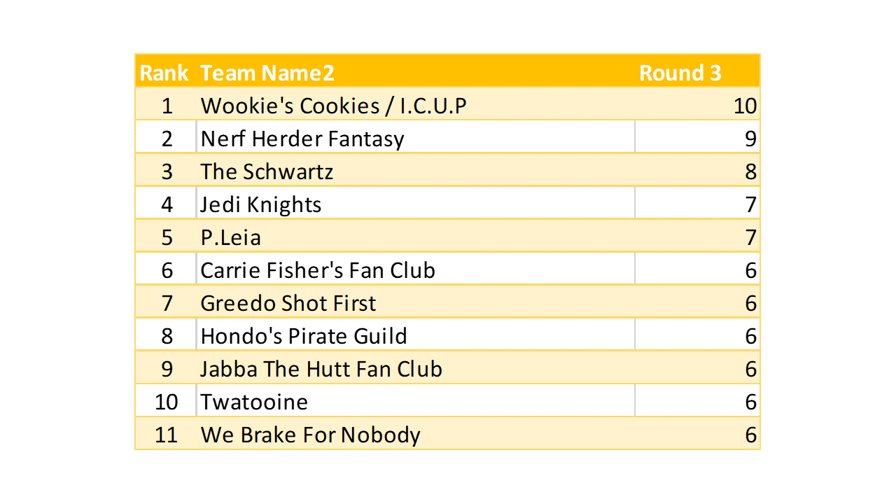 19 teams channeled the Force and came out to compete. We had a super-sized game of 6 rounds with 9 questions each, lots of visuals (visit the website) and a tie breaker to end the night with old friends and teammates pitted against each other in a head-to-head smackdown naming the 15 characters who racked up the most appearances in a Star Wars live action movie.