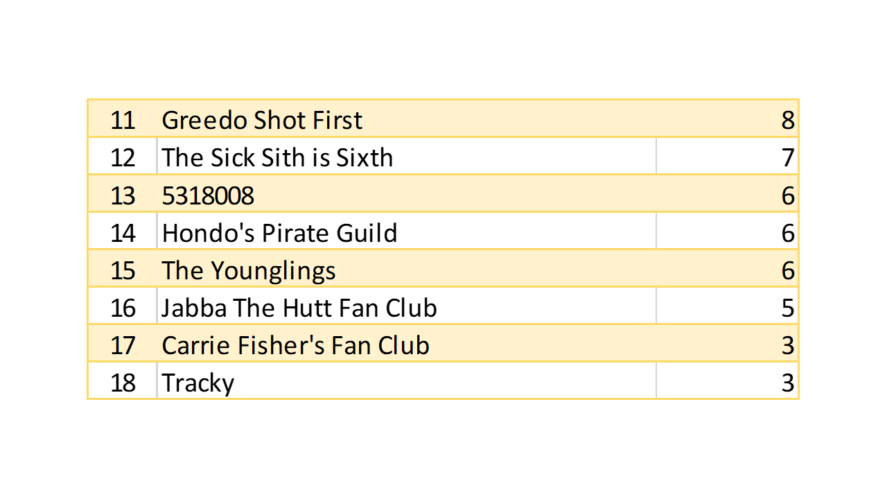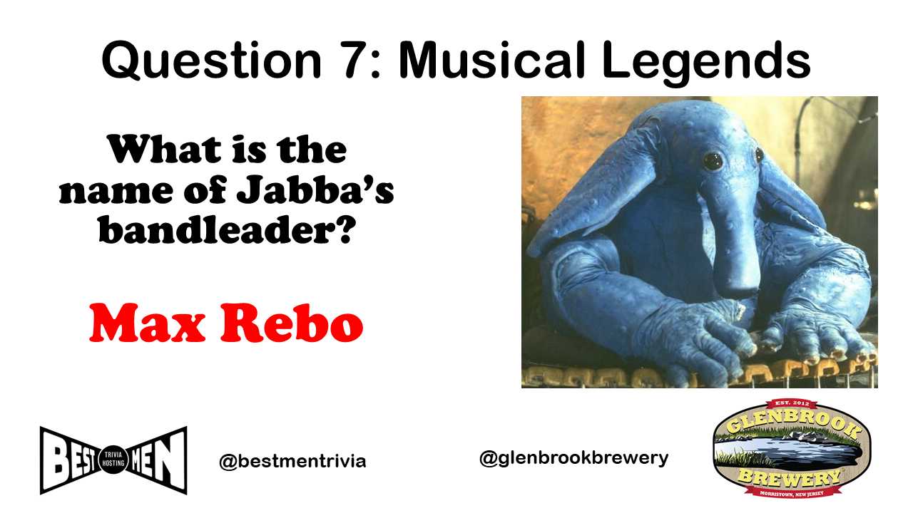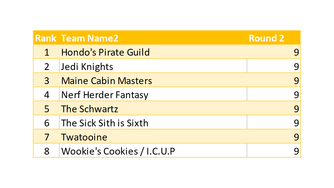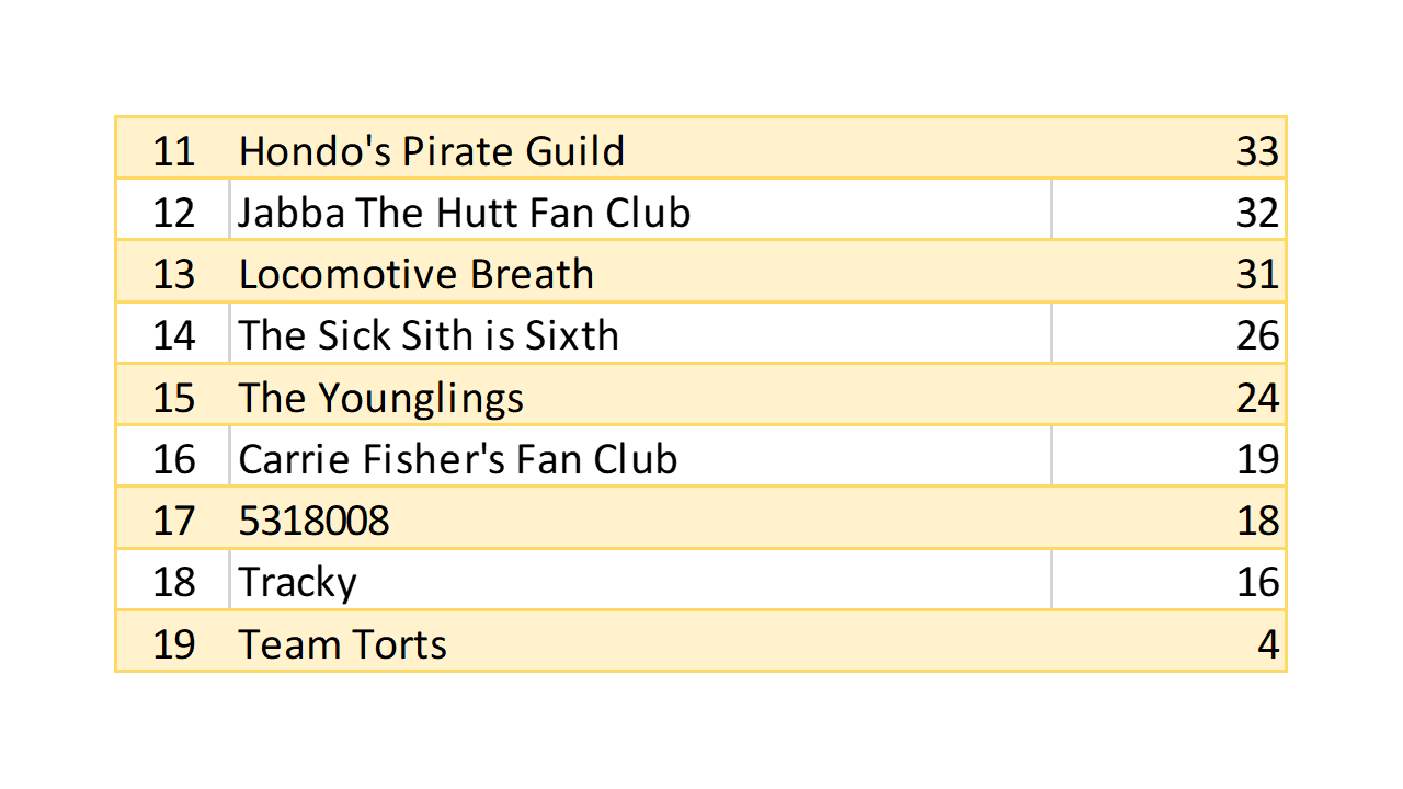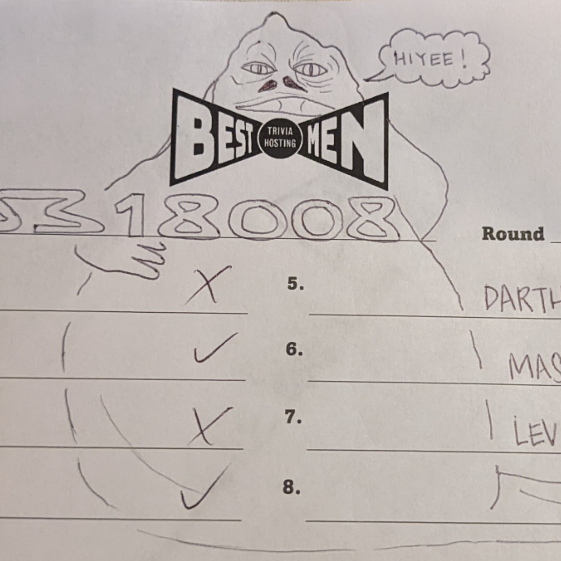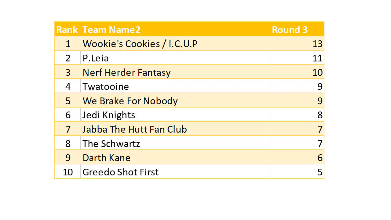 19 teams channeled the Force and came out to compete. We had a super-sized game of 6 rounds with 9 questions each, lots of visuals (visit the website) and a tie breaker to end the night with old friends and teammates pitted against each other in a head-to-head smackdown naming the 15 characters who racked up the most appearances in a Star Wars live action movie.