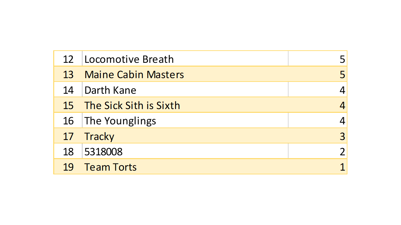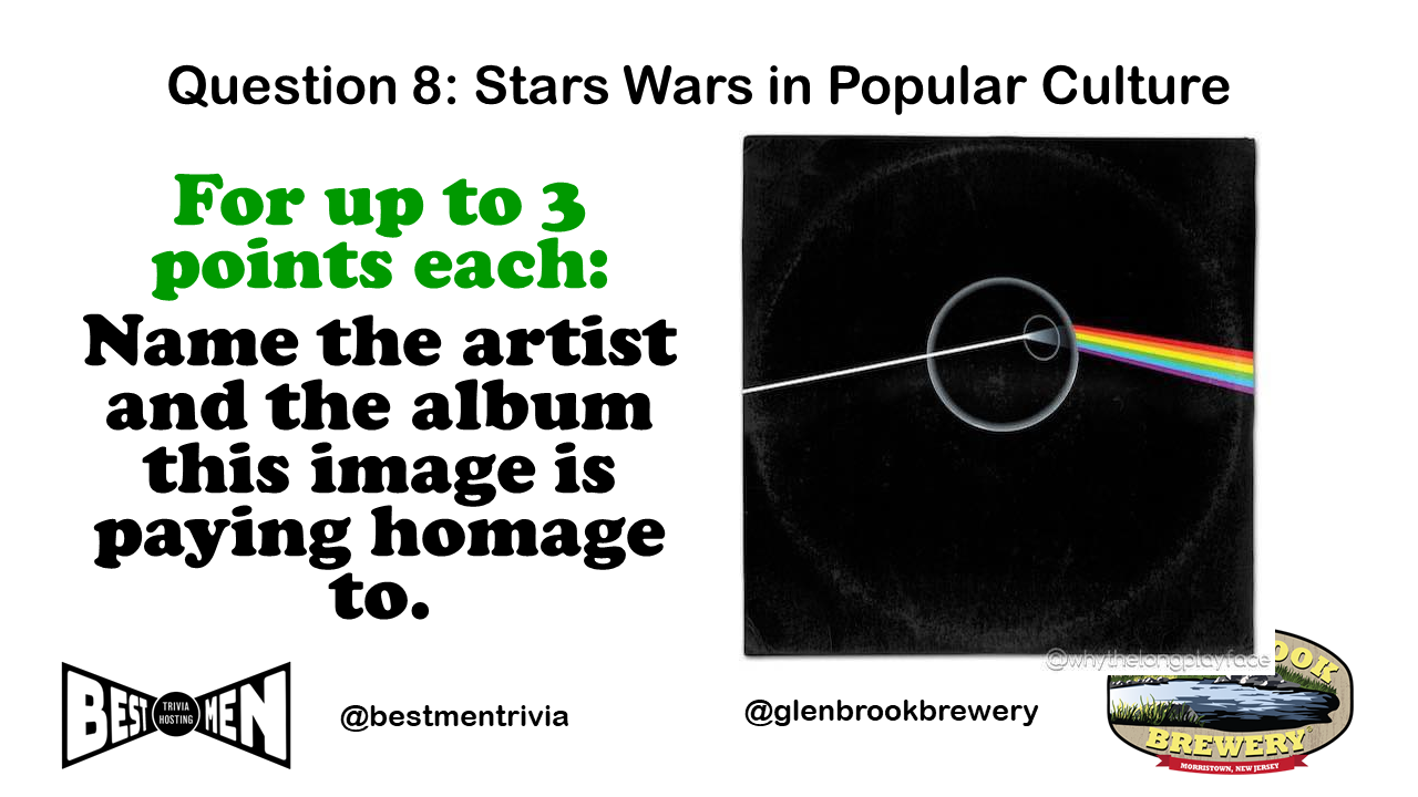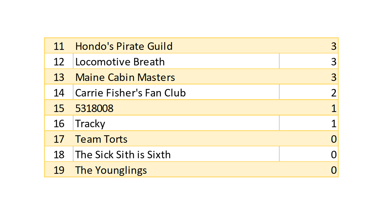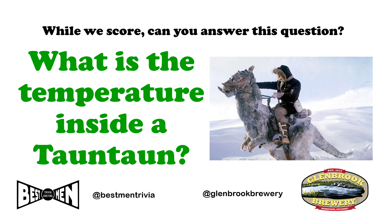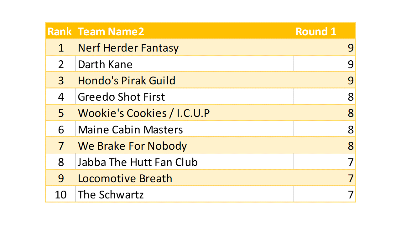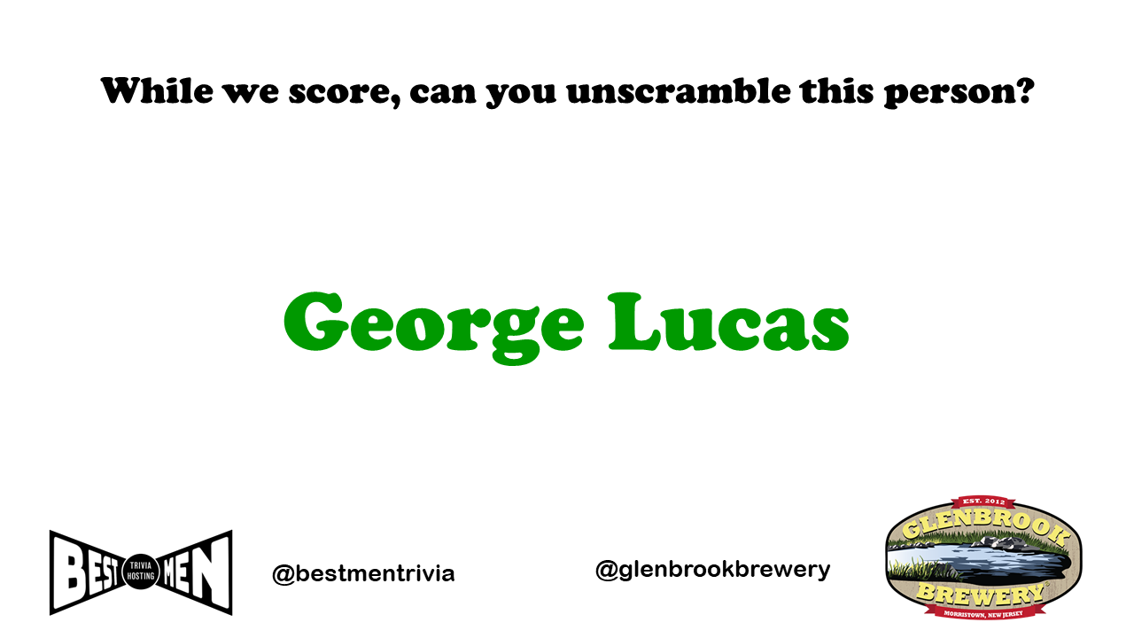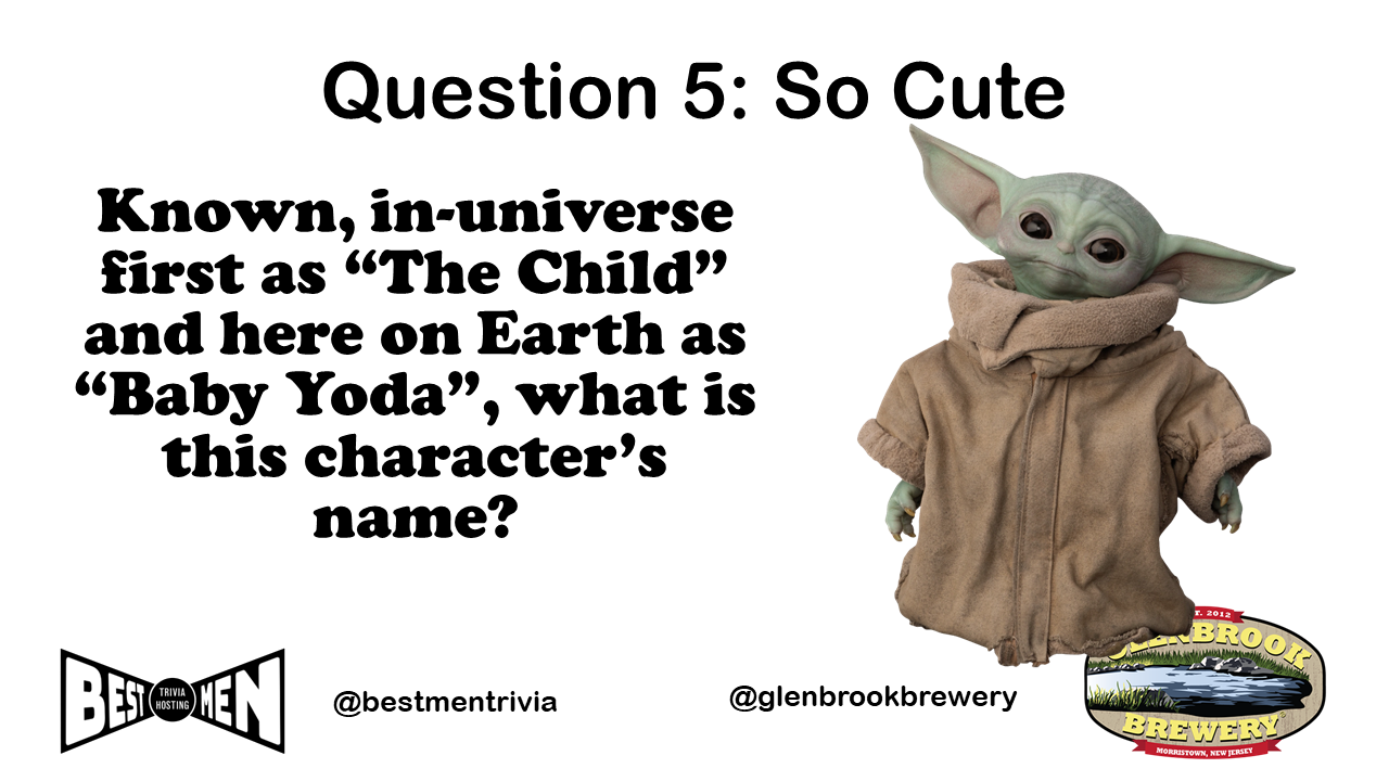 19 teams channeled the Force and came out to compete. We had a super-sized game of 6 rounds with 9 questions each, lots of visuals (visit the website) and a tie breaker to end the night with old friends and teammates pitted against each other in a head-to-head smackdown naming the 15 characters who racked up the most appearances in a Star Wars live action movie.
