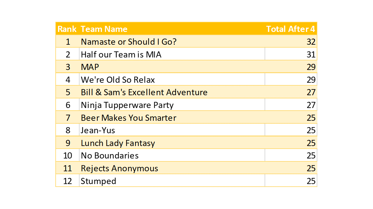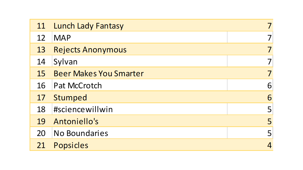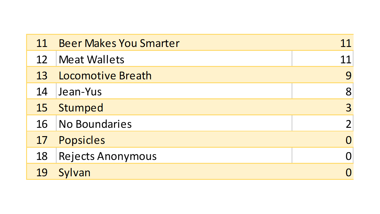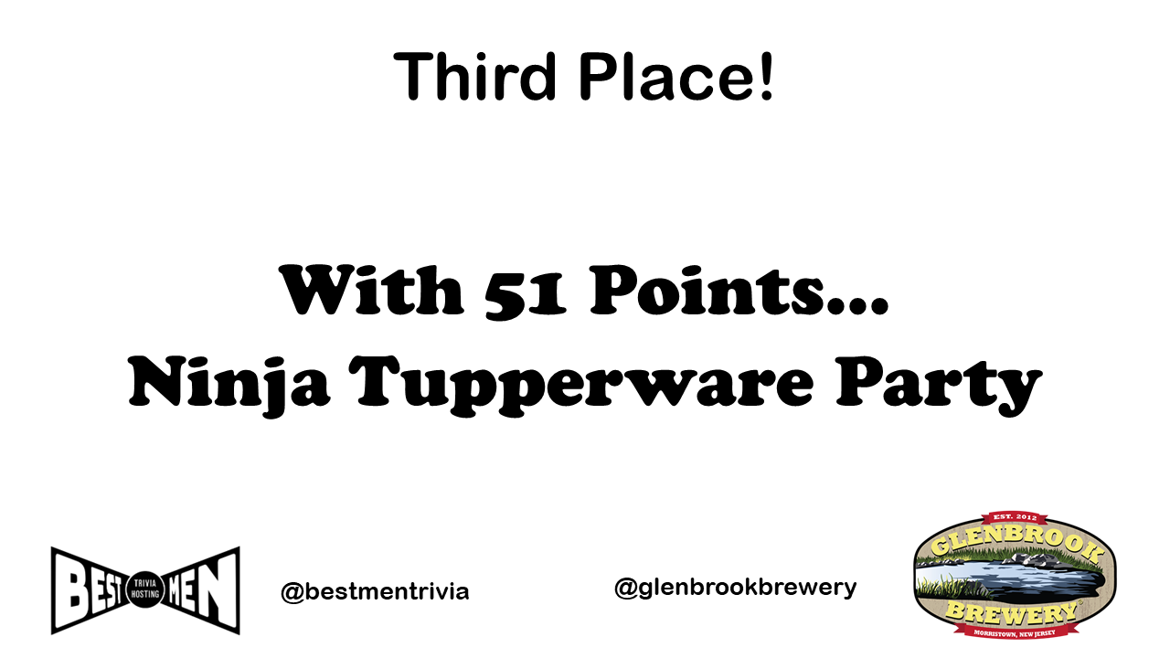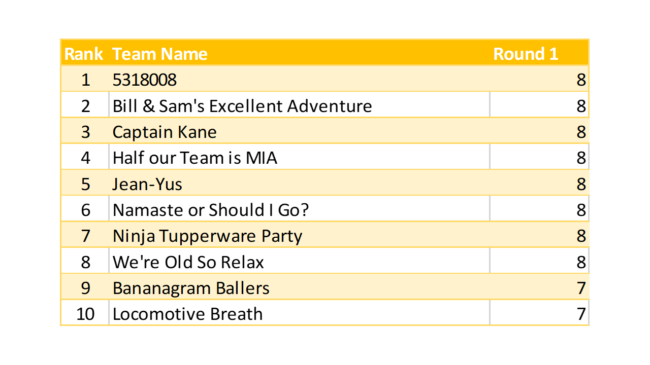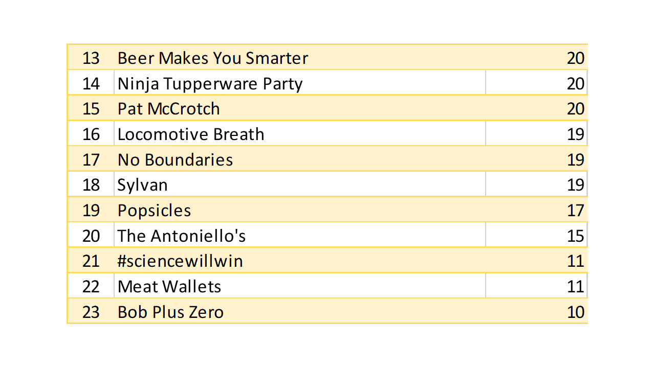We had 23 teams tonight?! Namaste Or Should I Go came out on top and we had to go to a tie breaker for 2nd and 3rd and Bill and Sam’s Excellent Adventure guessed the running time of The Batman a minute closer than Ninja Tupperware Party did to nab second.