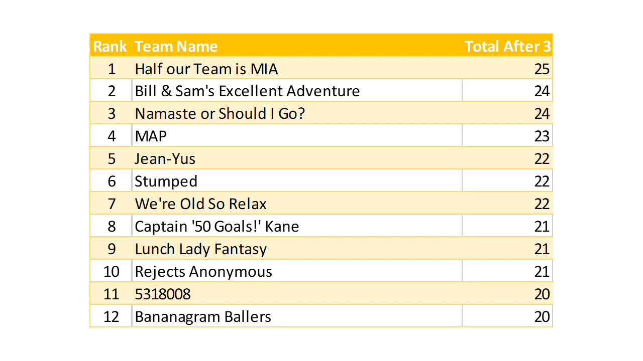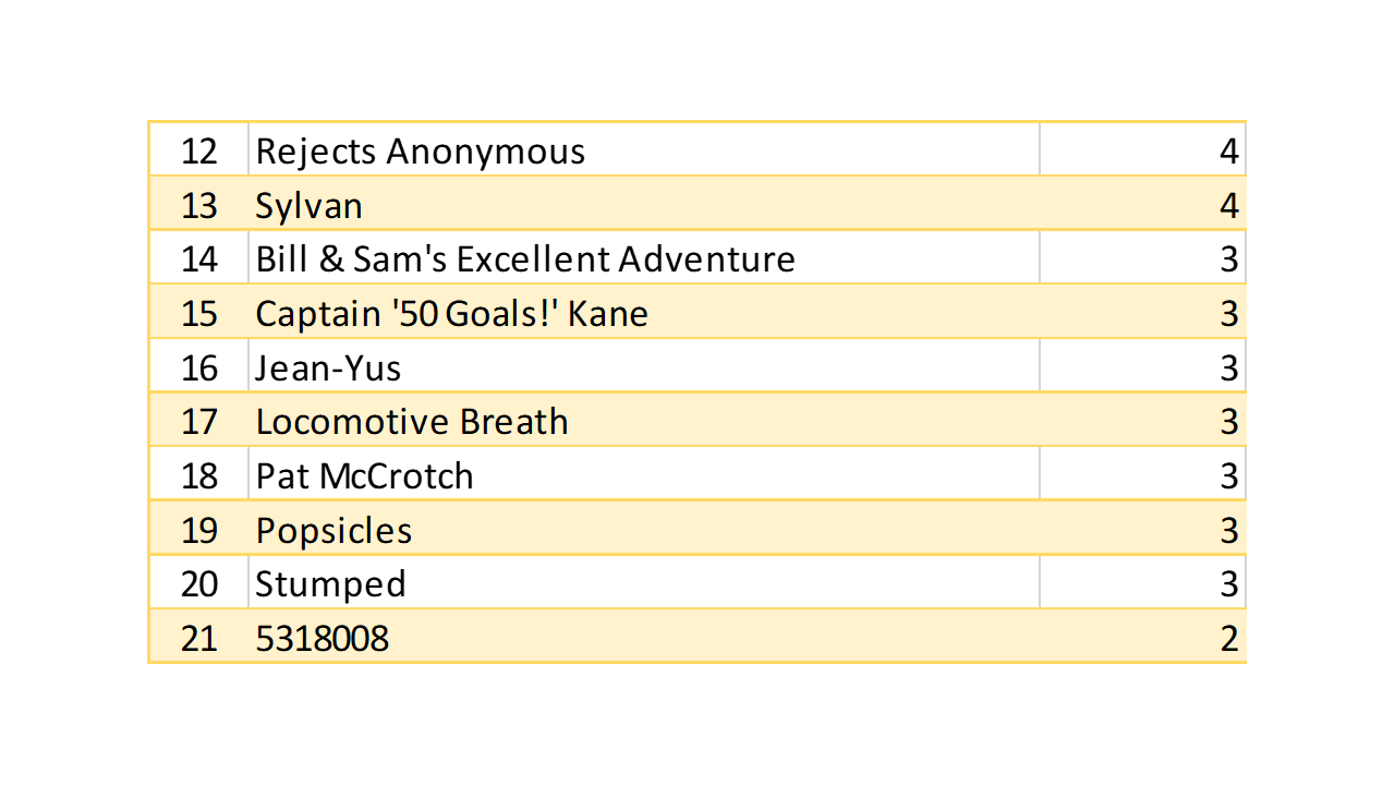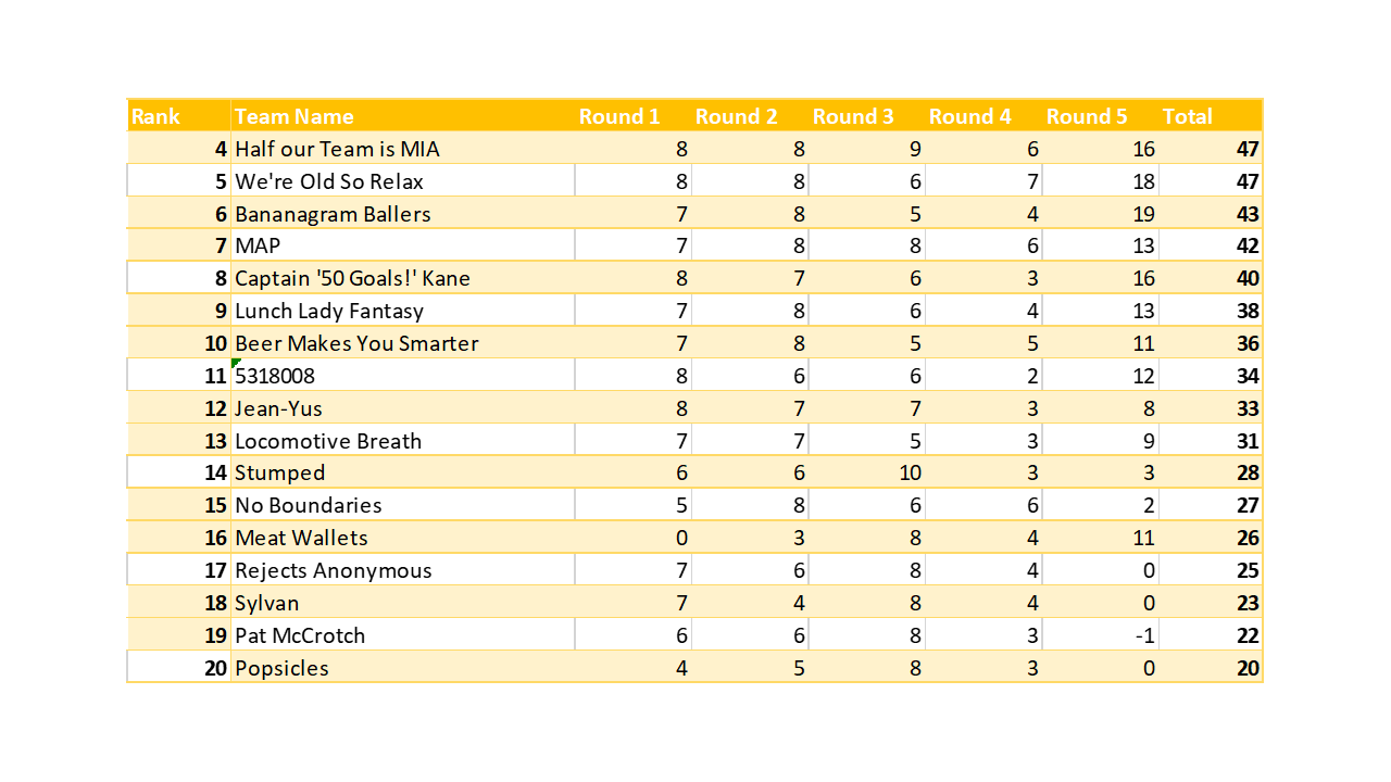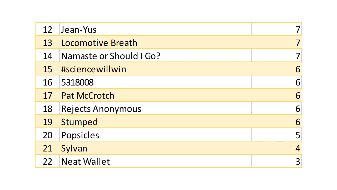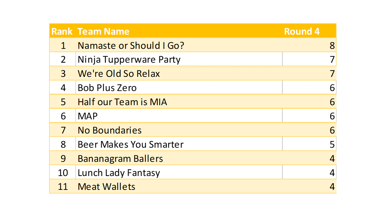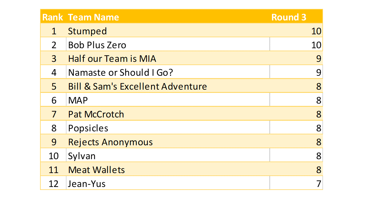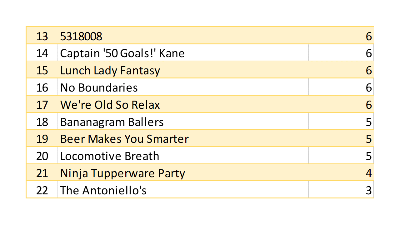 We had 23 teams tonight?! Namaste Or Should I Go came out on top and we had to go to a tie breaker for 2nd and 3rd and Bill and Sam’s Excellent Adventure guessed the running time of The Batman a minute closer than Ninja Tupperware Party did to nab second.